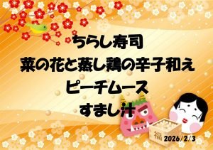 2026.01.16 管理栄養士より 管理栄養士より 2月 今月は、3日の節分にちらし寿司、菜の花と蒸し鶏の辛子和え、ピーチムース、すまし汁をお出しします。来月はひな祭りイベント食を予定しております。 土・日・祝日の面会時間と予約についてのお願い 前の記事