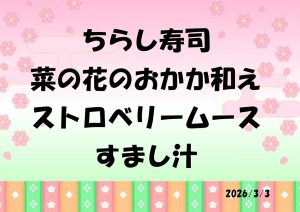 今月は、3日のひな祭りにちらし寿司、菜の花のおかか和え、ストロベリームース、